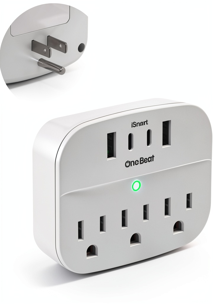 The One Beat power strip is a versatile wall plug extender featuring 3 AC outlets (15A/125V/1875W) and 4 smart USB ports, including 2 Type-C and 2 USB-A, designed to charge cell phones, laptops, cameras, and other devices efficiently. Constructed from durable polycarbonate (PC) material in a sleek white color, this non-foldable unit measures 4.02 x 3.15 x 2.24 inches and weighs 4.6 ounces, ensuring portability and resilience. It operates at 125 volts AC with a Type B plug format and includes multiple safety protections such as short-circuit, grounded, over-heating, over-current, fire-resistant, electric-shock, and over-voltage safeguards, providing reliable performance for everyday use.